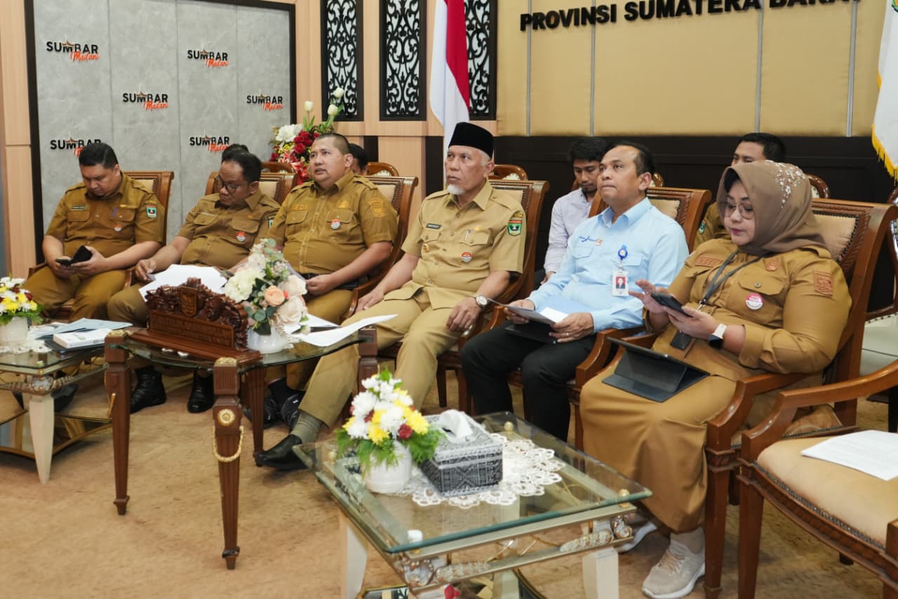 Gubernur Sumatera Barat Mahyeldi Ansharullah memimpin langsung rapat dari Ruang Podcast Azwar Anas, Istana Gubernur Sumbar, didampingi sejumlah pejabat penting daerah, di antaranya Asisten Administrasi Umum Medi Iswandi, Kepala BPKAD Rosail Akhyari, Kepala Biro Perekonomian Kuartini Deti Putri, Plt Kepala Bappeda Sumbar Yuda, dan Direktur Utama Bank Nagari Gusti Candra.