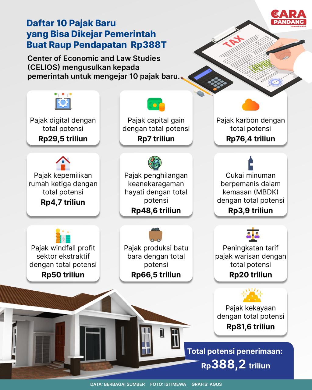 Beranda Infografis 10 Pajak Baru yang Bisa Dikejar Pemerintah untuk Raup Rp388 Triliun Infografis 10 Pajak Baru yang Bisa Dikejar Pemerintah untuk Raup Rp388 Triliun Penulis Amira Izzati - 15 Agustus 2025 21:13 0 10 Pajak Baru yang Bisa Dikejar Pemerintah untuk Raup Rp388 Triliun Tags Berita Sebelumnya Puan Ingatkan Kebijakan Harus Berorientasi pada Kepentingan Rakyat Berita Berikutnya Pemprov Sumbar Dorong Pemerintah Pusat Ambil Alih Pembayaran Gaji ASN di Tengah Pengurangan Dana Transfer ke Daerah LEAVE A REPLY Cancel reply Comment: Please enter your comment! Name:* Please enter your name here Email:* You have entered an incorrect email address! Please enter your email address here Website: Save my name, email, and website in this browser for the next time I comment. Berita Teratas Gubernur Sumbar Apresiasi PLN Serahkan 150 Kloni Lebah Galo-galo untuk Kelompok Tani Agam Siswa SMA 1 Payakumbuh Wakili Indonesia di Water Rocket Competition 2025 Malaysia Gubernur Sumbar Tinjau Korban Dugaan Keracunan MBG di RSUD Lubuk Basung Gubernur Mahyeldi dan ITB Haji Agus Salim Bukittinggi Tandatangani MoU, Perkuat Sinergi Pendidikan dan Pembangunan Daerah Gubernur Mahyeldi Buka Forum Ilmiah Neurologi Sumatera 2025: Tekankan Deteksi Dini dan Gaya Hidup Sehat Cegah Stroke Berita Terkait Berita Terkait