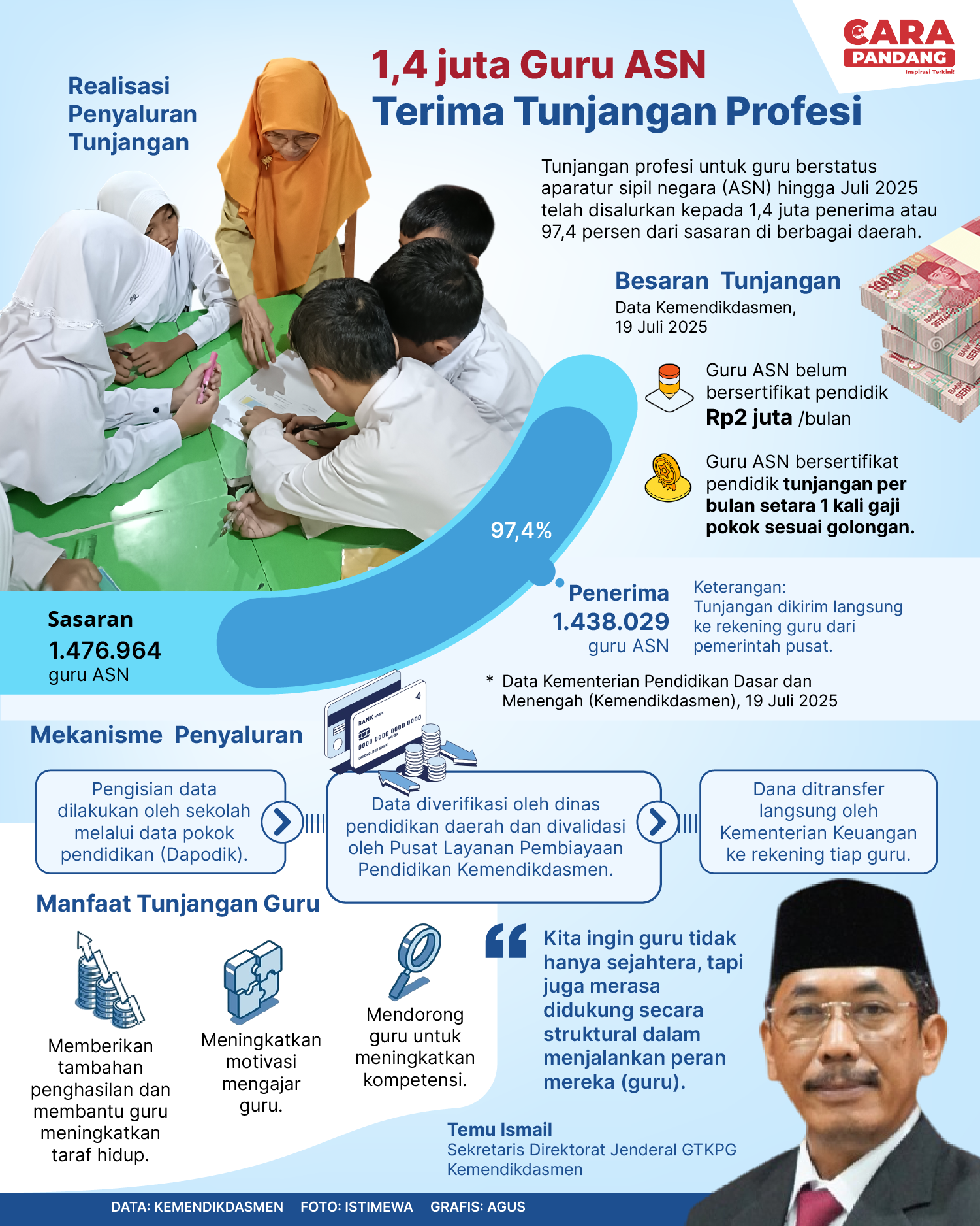 Beranda Infografis 1,4 Juta Guru ASN Terima Tunjangan Profesi Infografis 1,4 Juta Guru ASN Terima Tunjangan Profesi 1,4 Juta Guru ASN Terima Tunjangan Profesi. Penulis Edo Soeryadi - 24 Juli 2025 05:45 0 CARAPANDANG.COM - Guru ASN Terima Tunjangan Profesi. Tags Mendikdasmen AbdulMu'ti GTK ASN Tunjanga Profesi Berita Sebelumnya BNN dan Pemkab Solok Gelar Workshop Relawan Antinarkotika Nagari Bersinar di Koto Laweh Berita Berikutnya Payakumbuh Creative Festival 2025 Hadirkan 40 UMKM Kreatif dan Ratusan Peserta, Wawako: Momentum Penguatan Ekonomi Berbasis Kreativitas LEAVE A REPLY Cancel reply Comment: Please enter your comment! Name:* Please enter your name here Email:* You have entered an incorrect email address! Please enter your email address here Website: Save my name, email, and website in this browser for the next time I comment. Berita Teratas Sosialisasi Masyarakat Peduli Api : Dorong Kesadaran Publik Kelola Lahan Tanpa Merusak Lingkungan 60 Anggota Paskibraka Kabupaten Solok Menimba Ilmu ke Badan Pembinaan Ideologi Pancasila Pengurus PARMUSI Sumbar Resmi Dilantik, Gubernur Ajak Perkuat Dakwah hingga Pelosok Payakumbuh Siapkan Reformasi Birokrasi Berbasis Asta Cita Usai Hadiri Rakornas Kepegawaian 2025 Peringati HUT Korpri, Pemkab Solok Laksanakan Seminar Peningkatan SDM : Menuju ASN yang berAKHLAK Berita Terkait Berita Terkait