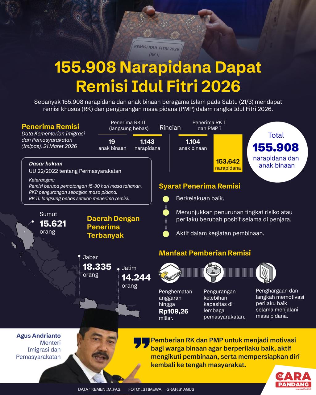 Beranda Infografis 155.908 Narapidana Dapat Remisi Idulfitri 2026 Infografis 155.908 Narapidana Dapat Remisi Idulfitri 2026 Penulis Amira Izzati - 23 Maret 2026 22:26 0 155.908 Narapidana Dapat Remisi Idulfitri 2026 Tags Berita Sebelumnya Ketua Partai Demokrat Israel: Netanyahu Sengaja Perpanjang Perang untuk Pertahankan Kekuasaannya Berita Berikutnya Pimpinan MPR Sebut Perlu Ada Kebijakan dan Aksi Responsif Hadapi Panas Ekstrem di Indonesia LEAVE A REPLY Cancel reply Comment: Please enter your comment! Name:* Please enter your name here Email:* You have entered an incorrect email address! Please enter your email address here Website: Save my name, email, and website in this browser for the next time I comment. Berita Teratas Safari Ramadan di Pesisir Selatan, Sekda Sumbar Ajak Masyarakat Jaga Generasi Muda dari Pengaruh Narkoba Wali Kota Zulmaeta Tinjau Pusat Pasar Payakumbuh, Pastikan Ekonomi Bergerak Jelang Lebaran Pemko Payakumbuh Matangkan Persiapan Salat Idul Fitri 1447 H di Balai Kota Safari Ramadan di Padang Panjang, Mahyeldi Tegaskan Komitmen Cetak Generasi Cerdas dan Bermoral Ikuti Hasil Sidang Isbat, Pemprov Sumbar Gelar Salat Idul Fitri Sabtu, 21 Maret 2026 Berita Terkait Berita Terkait