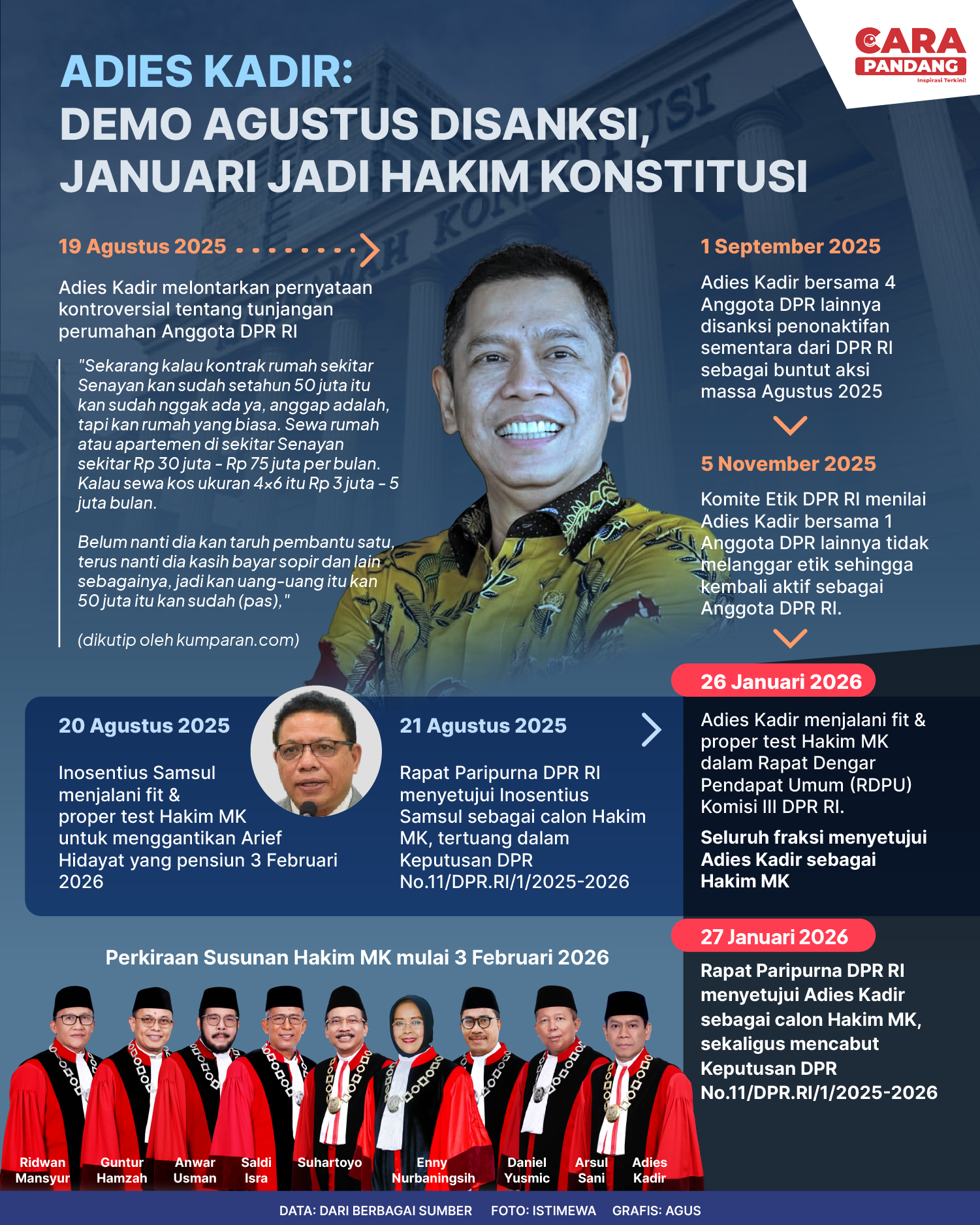 Beranda Infografis Adies Kadir Jadi Hakim Konstitusi Infografis Adies Kadir Jadi Hakim Konstitusi Penulis Amira Izzati - 30 Januari 2026 14:13 0 Adies Kadir Jadi Hakim Konstitusi Tags Berita Sebelumnya Resmikan 76 Revitalisasi Sekolah Pasca Bencana di Aceh, Mendikdasmen : Ini Bentuk Komitmen Pemerintah Berita Berikutnya Tentang Stagflasi AS, Pemerintah Pastikan Masih Jauh tapi Pengamat Sebut Risiko Cukup Tinggi LEAVE A REPLY Cancel reply Comment: Please enter your comment! Name:* Please enter your name here Email:* You have entered an incorrect email address! Please enter your email address here Website: Save my name, email, and website in this browser for the next time I comment. Berita Teratas Gubernur Mahyeldi Serahkan Proposal Pembangunan Pusat Kebudayaan Sumbar Rp382,65 Miliar kepada Menteri Kebudayaan Safari Ramadan di Padang Panjang, Wagub Vasko Ruseimy Serahkan Bantuan Bedah Rumah untuk Salah Seorang Warga Tanah Hitam Buka Puasa Bersama di PSDKU UNP Payakumbuh, Wawako Tekankan Sinergi Bangun SDM Unggul Pemko Payakumbuh Terapkan WFA bagi ASN Jelang Libur Nyepi dan Idul Fitri Proses Pengadaan Tanah Flyover Sitinjau Lauik Capai Progres Penting Berita Terkait Berita Terkait
