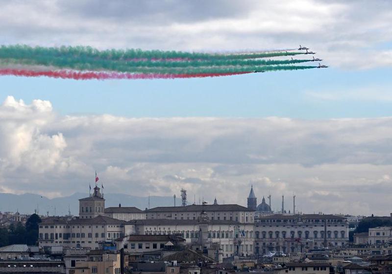 Tim aerobatik Italia Frecce Tricolori terbang di atas Roma dalam upacara penyalaan kaldron Olimpiade Musim Dingin Milan-Cortina 2026 di Istana Quirinale di Roma, Italia, pada 5 Desember 2025. (Xinhua/Alberto Lingria)