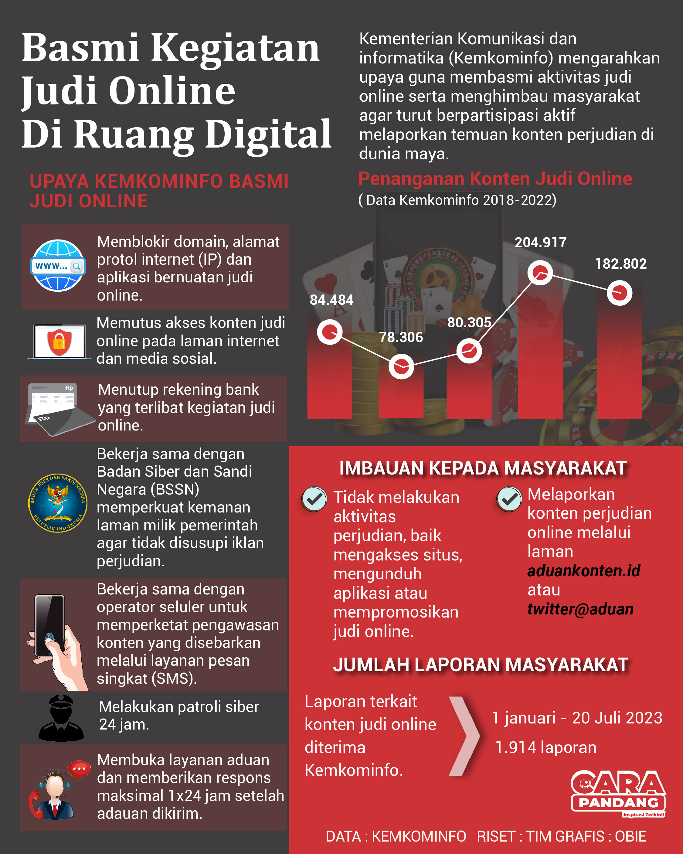 CARAPANDANG - Kemkominfo mengarahkan upaya guna membasmi aktivitas judi online serta menghimbau masyarakat agar turut berpartisipasi aktif melaporkan temuan konten perjudian di dunia maya