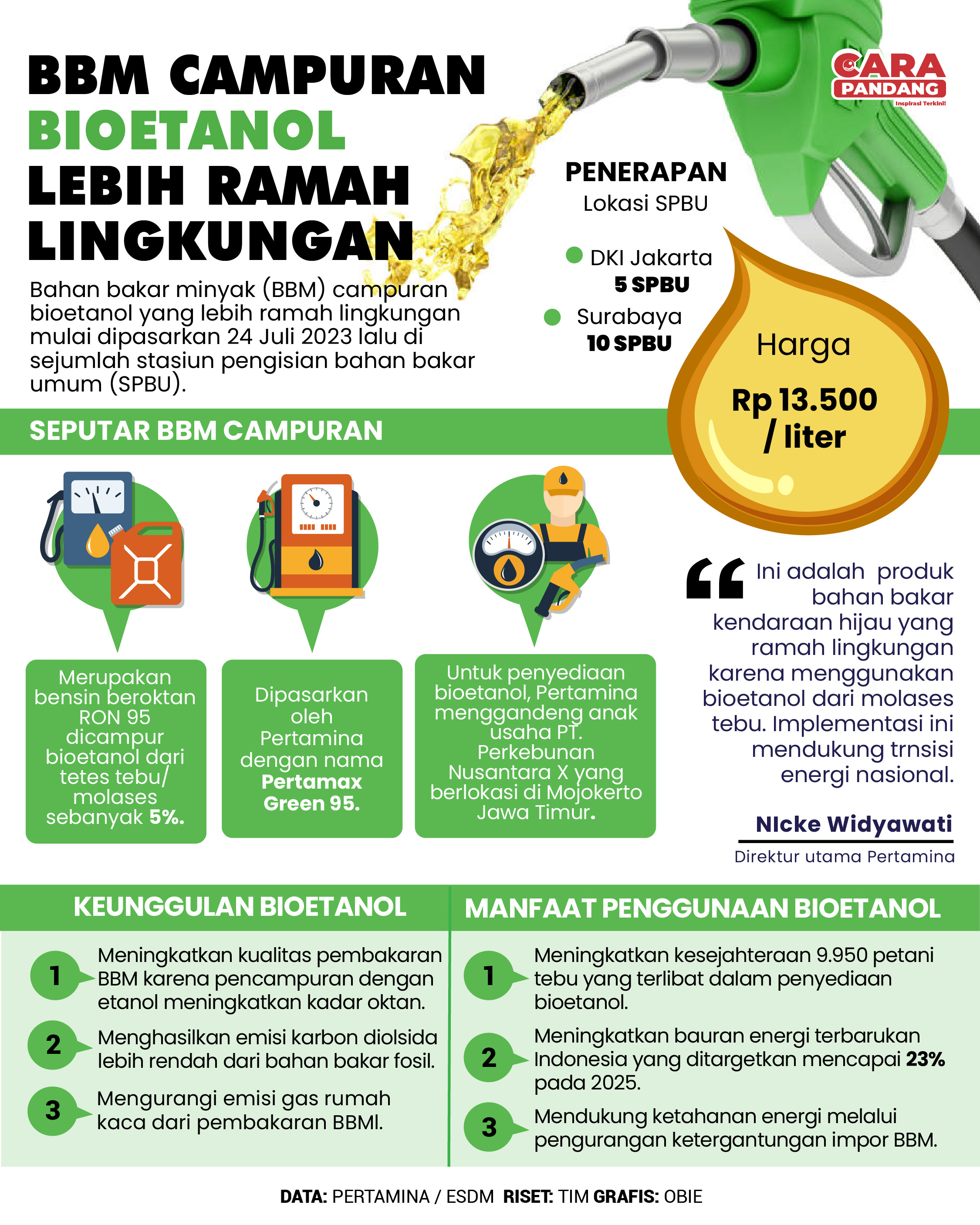Bahan bakar minyak (BBM) campuran bioetanol yang lebih ramah lingkungan mulai dipasarkan 24 Juli 2023 lalu