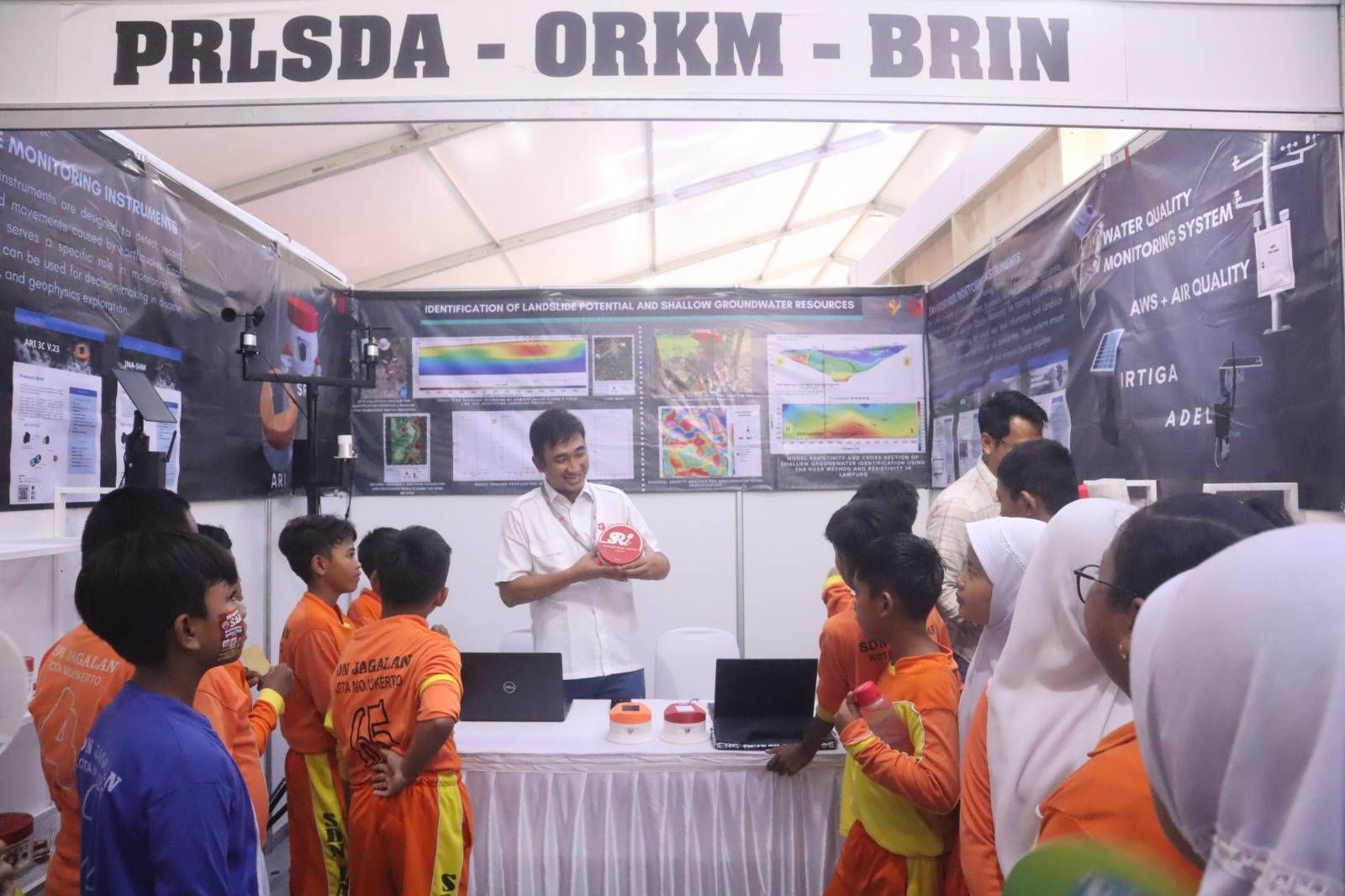 CARAPANDANG - Periset Ahli Muda Pusat Riset Limnologi dan Sumber Daya Air (PRLSDA) BRIN, Tio Azhar Prakoso Setiadi, memperkenalkan prototipe produk inovasi Akselerograf Rakyat Indonesia (ARI). Perkenalan ini dilakukan di kompleks GOR dan Seni Mojopahit, Mojokerto, Jawa Timur, baru-baru ini.