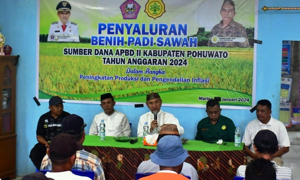 POHUWATO, CARAPANDANG.COM - Para petani dan kelompok tani yang ada di Desa Bulili dan sebagian Desa Buntulia Selatan, Kecamatan Duhiadaa menerima bantuan benih padi sawah yang diserahkan secara simbolis oleh Bupati Pohuwato, Saipul A. Mbuinga, Jum’at, (26/01/2024).