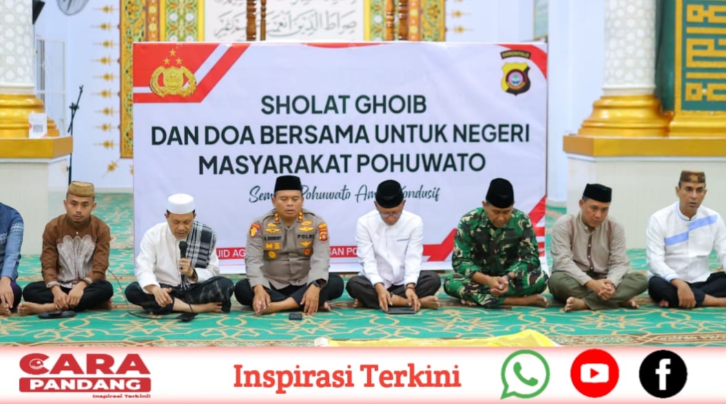POHUWATO, CARAPANDANG - Komandan Kodim (Dandim) 1313/Pohuwato Letkol Inf Madiyan Surya, Hub. Int., M. Han., bersama jajaran Forum Komunikasi Pimpinan Daerah (Forkopimda) Kabupaten Pohuwato dan perwakilan komunitas ojek online (ojol), melaksanakan Sholat Ghoib dan doa bersama di Masjid Agung Baiturrahman Pohuwato. Acara ini diselenggarakan sebagai bentuk solidaritas dan kepedulian terhadap musibah yang melanda negeri ini. Sabtu (30/8/2025).
