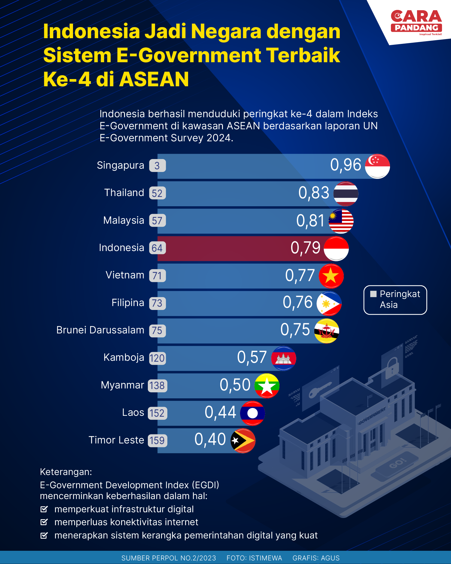 CARAPANDANG - Dalam laporan terbaru UN E-Government Survey 2024, Indonesia berhasil mencatatkan prestasi gemilang dengan menduduki peringkat ke-4 sebagai negara dengan sistem e-government terbaik di kawasan ASEAN.