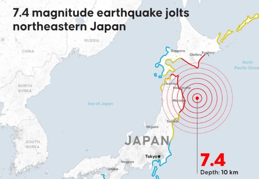 Badan Meteorologi Jepang (JMA) melaporkan pusat gempa berada di lepas pantai Sanriku, Prefektur Iwate, pada kedalaman sekitar 19 kilometer.