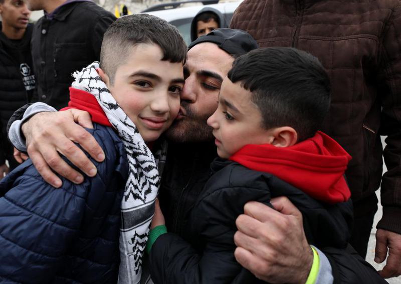 Anak-anak menyambut seorang tahanan Palestina (tengah) yang dibebaskan di Kota Ramallah, Tepi Barat, pada 8 Februari 2025. (Xinhua/Ayman Nobani)