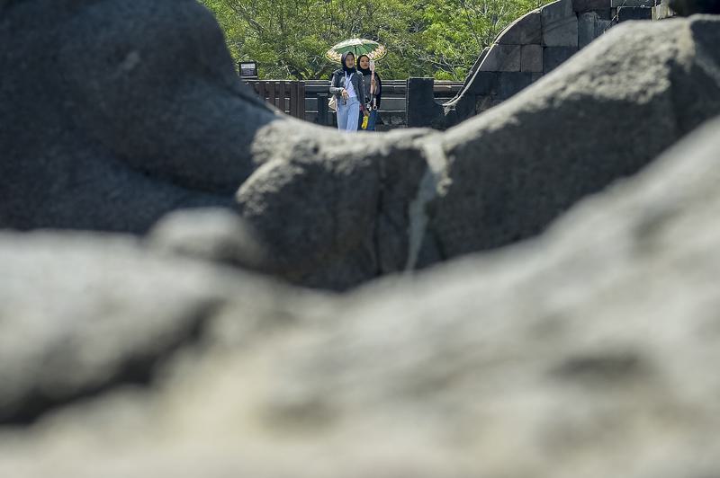 Foto yang diabadikan pada 29 Maret 2026 ini memperlihatkan para wisatawan domestik memakai payung untuk berlindung dari teriknya sinar matahari di kawasan situs Candi Prambanan di Daerah Istimewa Yogyakarta. (Carapandang/Xinhua/Agung Supriyanto)