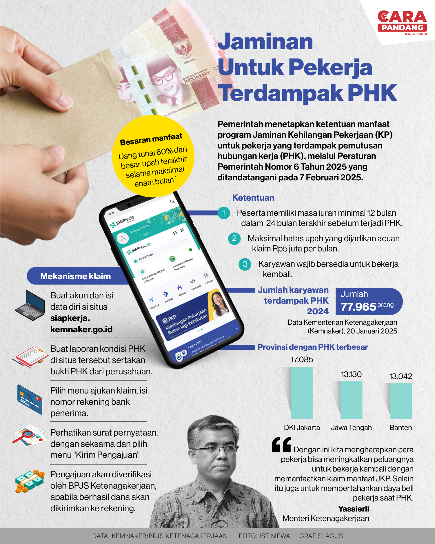 Beranda Infografis Jaminan Pekerja Terdampak PHK Infografis Jaminan Pekerja Terdampak PHK Penulis Amira Izzati - 19 Februari 2025 08:01 0 CARAPANDANG - Jaminan Pekerja Terdampak PHK Tags Berita Sebelumnya Presiden Prabowo Dijadwalkan Hadiri Sidang Istimewa Mahkamah Agung Berita Berikutnya Pemerintah Jadikan Penyakit Kardiovaskular sebagai Prioritas Utama Penanganan LEAVE A REPLY Cancel reply Comment: Please enter your comment! Name:* Please enter your name here Email:* You have entered an incorrect email address! Please enter your email address here Website: Save my name, email, and website in this browser for the next time I comment. Berita Teratas Sosialisasi Masyarakat Peduli Api : Dorong Kesadaran Publik Kelola Lahan Tanpa Merusak Lingkungan Buka Rakerda PKK Sumbar 2025, Mahyeldi Minta Gerakan PKK Aktif Hingga ke Nagari 60 Anggota Paskibraka Kabupaten Solok Menimba Ilmu ke Badan Pembinaan Ideologi Pancasila Pengurus PARMUSI Sumbar Resmi Dilantik, Gubernur Ajak Perkuat Dakwah hingga Pelosok Peringati HUT Korpri, Pemkab Solok Laksanakan Seminar Peningkatan SDM : Menuju ASN yang berAKHLAK Berita Terkait Berita Terkait
