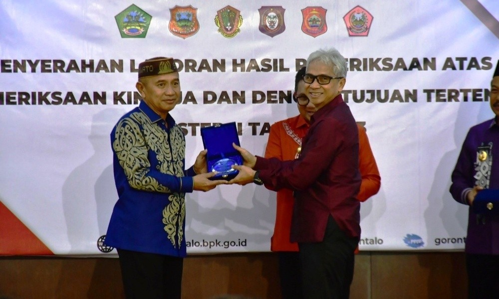 Piagam penghargaan dari BPK RI diserahkan oleh Kepala BPK RI Perwakilan Provinsi Gorontalo, Ahmad Luthfi H. Rahmatullah, S.E.,M.H.,Ak.,CA,CSFA yang diterima Bupati Pohuwato, Saipul A. Mbuinga di Auditorium Badan Pemeriksa Keuangan (BPK) RI Perwakilan Provinsi Gorontalo, Kamis (04/01/2024).
