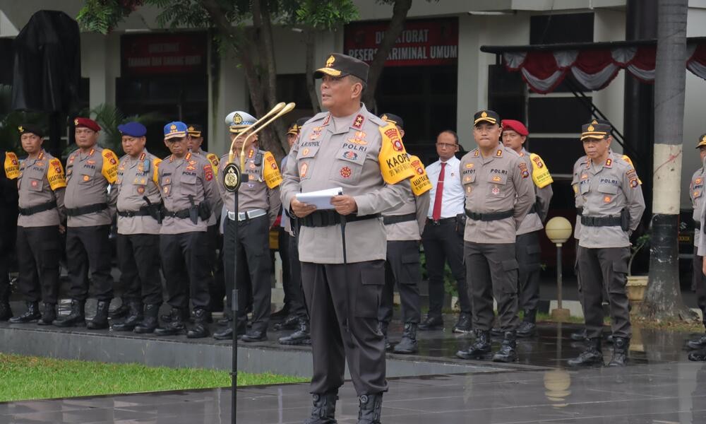 Kepala Kepolisian Daerah Gorontalo Irjen Pol Drs. Angesta Romano Yoyol, M.M, memimpin langsung apel pergeseran pasukan dalam rangka pengamanan tahapan pemungutan dan penghitungan suara Pemilu 2024. Senin (12/02).