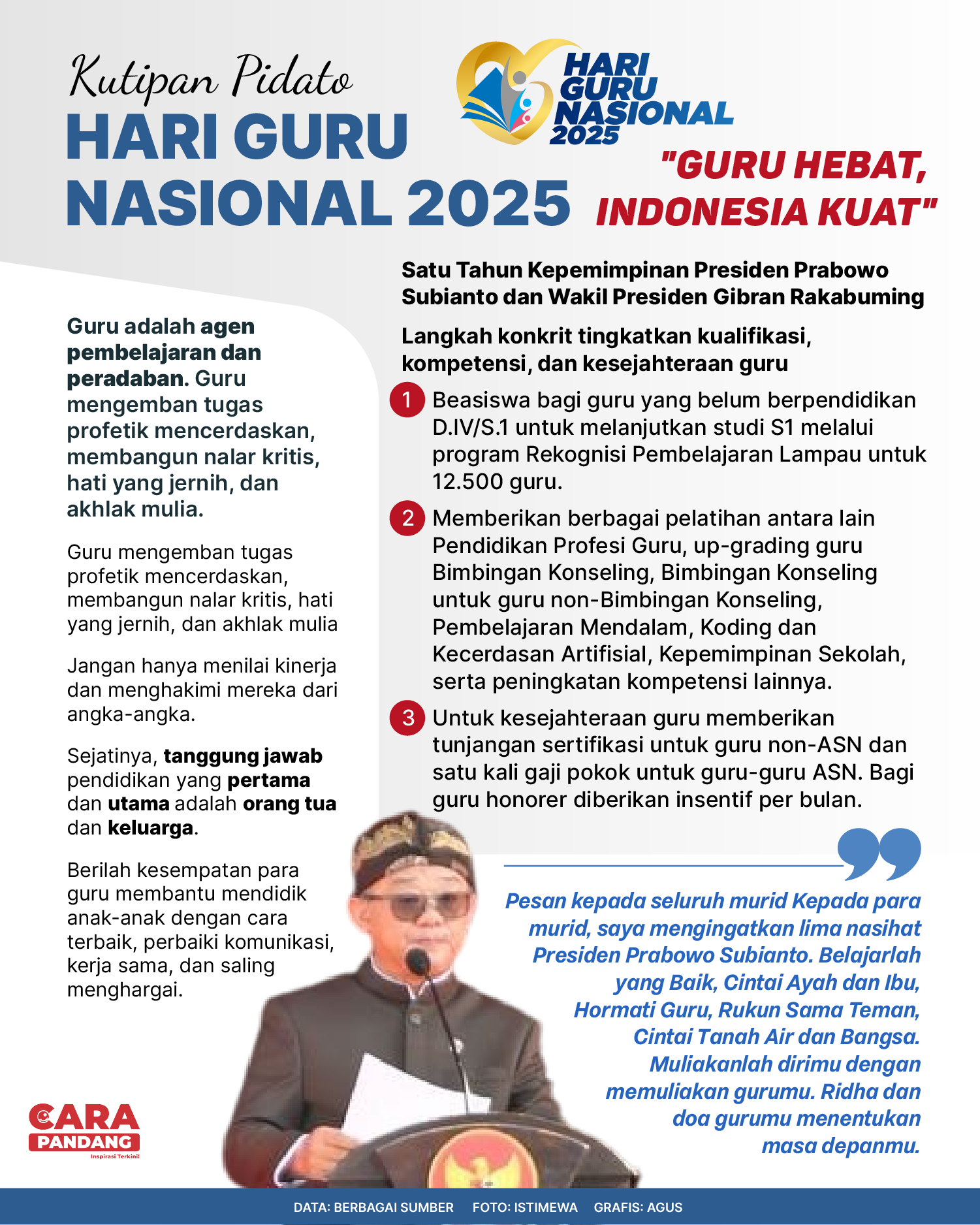 Beranda Infografis Kutipan Pidato Hari Guru Nasional 2025 Infografis Kutipan Pidato Hari Guru Nasional 2025 Penulis Amira Izzati - 28 November 2025 12:12 0 Kutipan Pidato Hari Guru Nasional 2025 Tags Berita Sebelumnya Putin: Ukraina Harus Gelar Pemilu Setelah Darurat Militer Dicabut Berita Berikutnya Badan Anti-Korupsi Ukraina Geledah Rumah Kepala Staf Presiden Zelenskyy LEAVE A REPLY Cancel reply Comment: Please enter your comment! Name:* Please enter your name here Email:* You have entered an incorrect email address! Please enter your email address here Website: Save my name, email, and website in this browser for the next time I comment. Berita Teratas DWP Sumbar Gelar Bakti Sosial HUT ke-26, Salurkan Wakaf Al-Qur’an ke Rumah Tahfiz dan Panti Sosial Payakumbuh Creative Festival 2025 Hadirkan 40 UMKM Kreatif dan Ratusan Peserta, Wawako: Momentum Penguatan Ekonomi Berbasis Kreativitas Wali Kota Payakumbuh Tegaskan Komitmen Perangi Narkoba, Nunang Daya Bangun Dijadikan Percontohan Kampung Bebas Narkoba Pemko Payakumbuh Salurkan 141,98 Ton Beras dan 28.396 Liter Minyak Goreng untuk 7.099 Keluarga Bupati Agam Tinjau Lokasi Terdampak Bencana di Palupuah, Pastikan Penanganan Maksimal Berita Terkait Berita Terkait
