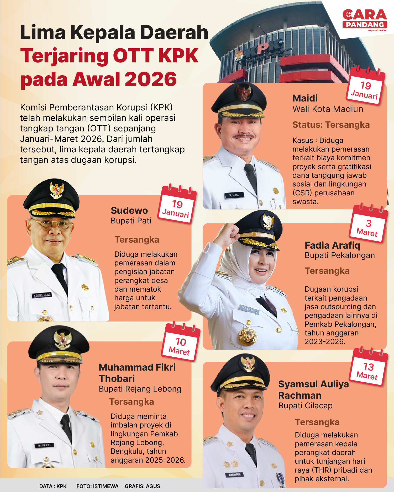 Beranda Infografis Lima Kepala Daerah Terjaring OTT KPK Awal 2026 Infografis Lima Kepala Daerah Terjaring OTT KPK Awal 2026 Penulis Amira Izzati - 15 Maret 2026 16:17 0 Lima Kepala Daerah Terjaring OTT KPK Awal 2026 Tags Berita Sebelumnya Wapres Gibran Ingatkan Pemudik Jaga Kesehatan dan Keselamatan dalam Perjalanan Berita Berikutnya Amarah dan Paku LEAVE A REPLY Cancel reply Comment: Please enter your comment! Name:* Please enter your name here Email:* You have entered an incorrect email address! Please enter your email address here Website: Save my name, email, and website in this browser for the next time I comment. Berita Teratas Sahur Bersama Warga, Gubernur Mahyeldi Serahkan Bantuan Bedah Rumah untuk Keluarga Kurang Mampu di Pasaman Buka Puasa Bersama Niniak Mamak dan Bundo Kanduang, Wako Zulmaeta Paparkan Arah Pembangunan Payakumbuh Wagub Vasko Safari Ramadan di Muaro Kalaban, Tegaskan Dukungan untuk Pembangunan Sawahlunto Pemko Payakumbuh Resmikan Masjid Ramah Pemudik 1447 H di Masjid Musafir Kubu Gadang Gubernur Mahyeldi Serahkan Proposal Pembangunan Pusat Kebudayaan Sumbar Rp382,65 Miliar kepada Menteri Kebudayaan Berita Terkait Berita Terkait