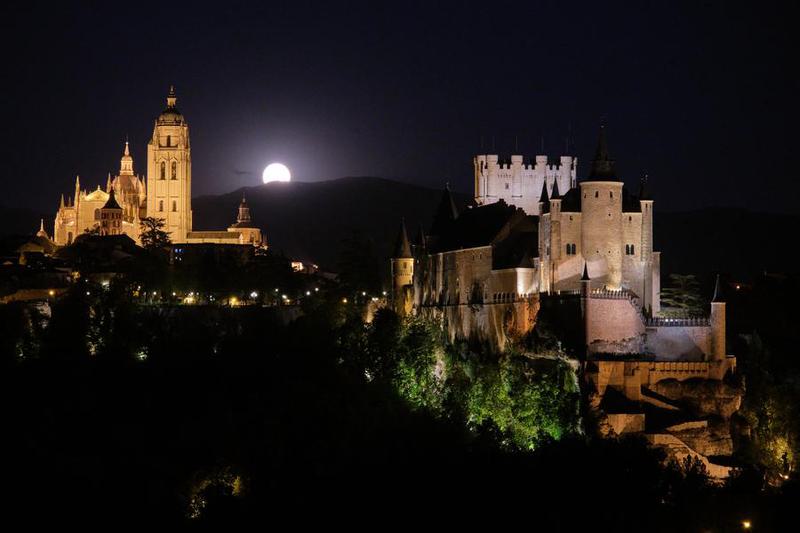 Pemandangan Katedral Segovia (kiri) dan Kastel Segovia di bawah sinar rembulan di Segovia, Spanyol. (Xinhua/Meng Dingbo)