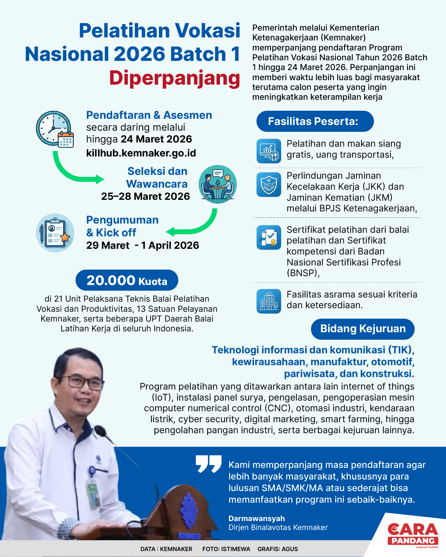 Pemerintah melalui Kementerian Ketenagakerjaan (Kemnaker) memperpanjang pendaftaran Program Pelatihan Vokasi Nasional 2026  Batch 1 hingga 24 Maret 2026