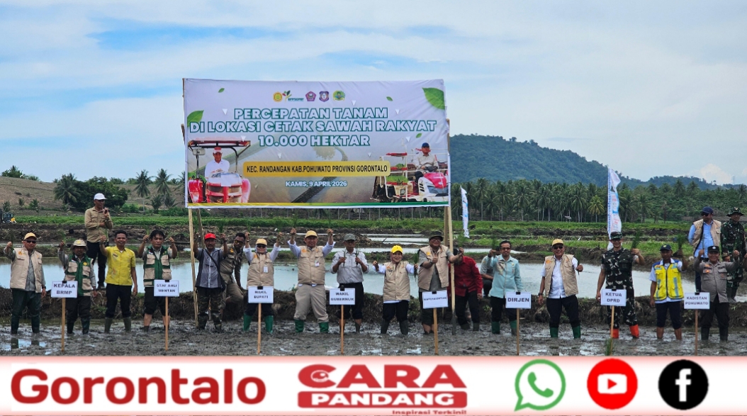 POHUWATO, CARAPANDANG - Program percepatan tanam padi kembali digencarkan di Kabupaten Pohuwato, Provinsi Gorontalo. Kegiatan tanam padi bersama secara serentak seluas 10.000 hektar digelar di lokasi cetak sawah rakyat Desa Motolohu Selatan, Kecamatan Randangan, Kamis (09/04/2026).