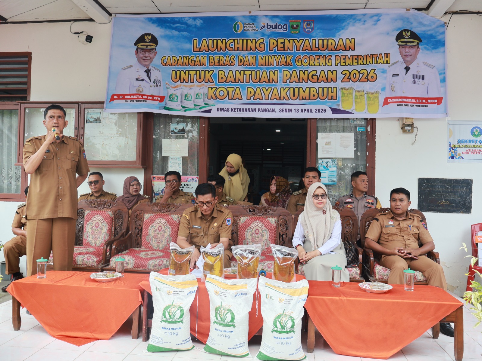 PAYAKUMBUH, CARAPANDANG - Pemerintah Kota Payakumbuh menyalurkan bantuan Cadangan Beras Pemerintah (CPP) dan minyak goreng kepada masyarakat penerima manfaat. Penyaluran secara simbolis dilakukan oleh Wali Kota Payakumbuh, Zulmaeta melalui Asisten Bidang Perekonomian dan Pembangunan, Yasrizal, di halaman Kantor Lurah Tigo Koto Diate, Kecamatan Payakumbuh Utara, Senin (13/4/2026).