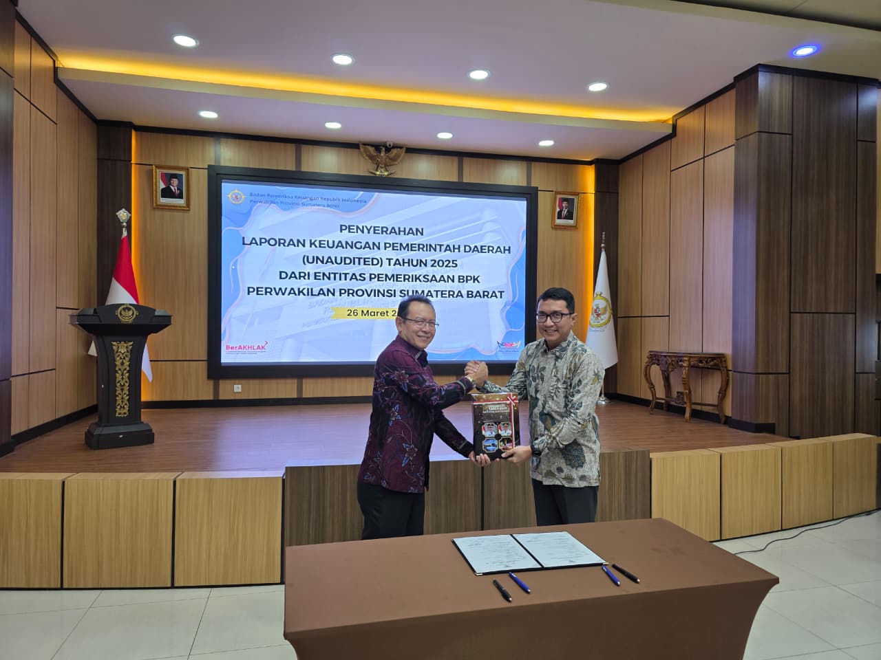 PAYAKUMBUH, CARAPANDANG - Wali Kota Payakumbuh, Zulmaeta, menyerahkan Laporan Keuangan Pemerintah Daerah (LKPD) unaudited Tahun Anggaran 2025 kepada Badan Pemeriksa Keuangan (BPK) Perwakilan Provinsi Sumatera Barat di Padang, Kamis (26/03/2026).