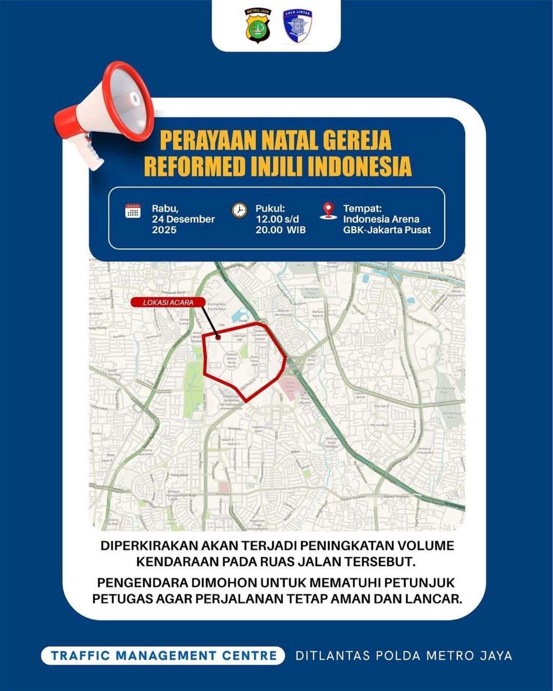 TMC Polda Metro Jaya menyebut kepadatan dipicu rangkaian ibadah perayaan Natal. Kegiatan berlangsung di Indonesia Arena GBK pukul 12.00 hingga 20.00 WIB.