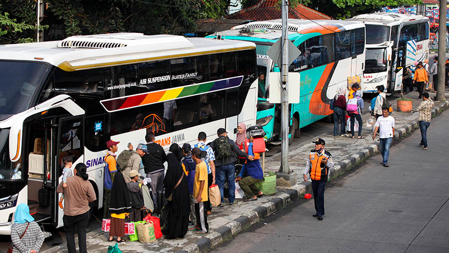 Ribuan penumpang tiba menggunakan bus Antar Kota Antar Provinsi (AKAP) di Terminal Bus Tanjung Priok, Jakarta Utara, pada arus balik Natal dan Tahun Baru 2026 (Nataru).
