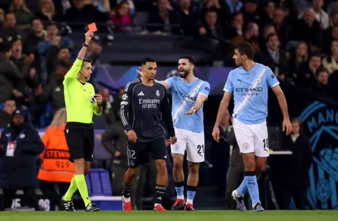 Turpin mengambil keputusan tegas yang mengejutkan publik Etihad: penalti untuk Real Madrid dan kartu merah untuk Bernardo Silva (Getty Images)