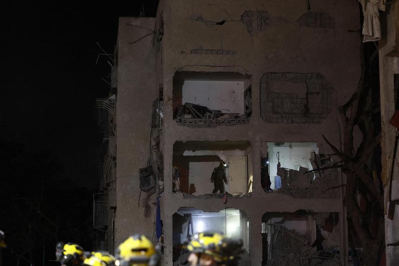 Petugas tanggap darurat bekerja di sebuah lokasi yang terkena serangan rudal Iran di Arad, Israel selatan, pada 22 Maret 2026. (Carapandang/Xinhua/Jamal Awad)