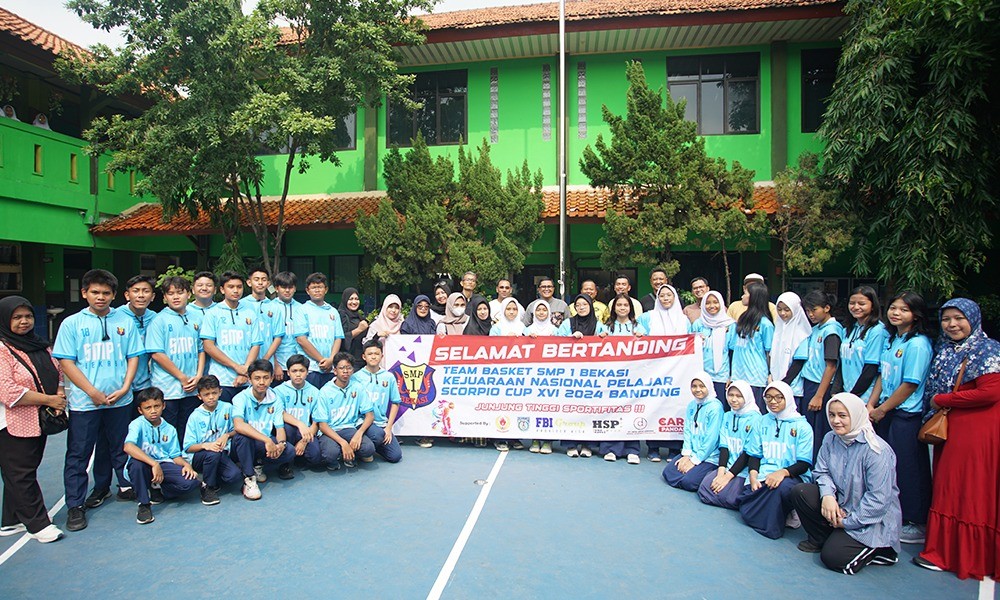 CARAPANDANG - Kepala Sekolah SMPN 1 Kota Bekasi Muktia Wahyudi Isra melepas keberangkatan tim basket SMPN 1 Kota Bekasi ke Kejuaraan Nasional Bola Basket 5x5 Antar Pelajar Scorpio Cup XVI 2023 di Kota Bandung. Pelepasan ini dilakukan di lapangan sekolah SMPN 1 Kota Bekasi, Jumat (26/1).