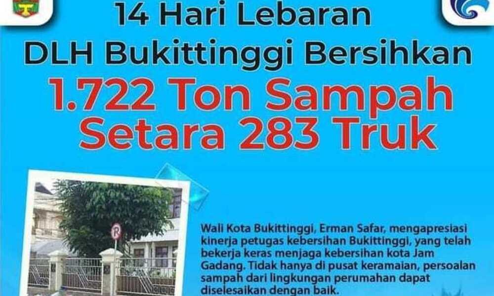 BUKITTINGGI, CARAPANDANG - Dinas Lingkungan Hidup mencatat, selama 14 hari libur lebaran, mulai dari 8 hingga 21 April 2024, pihaknya membersihkan 1.722 ton sampah atau setara dengan 283 truk. Pernyataan ini di sampaikan Wali Kota Bukittinggi Rabu (24/04).