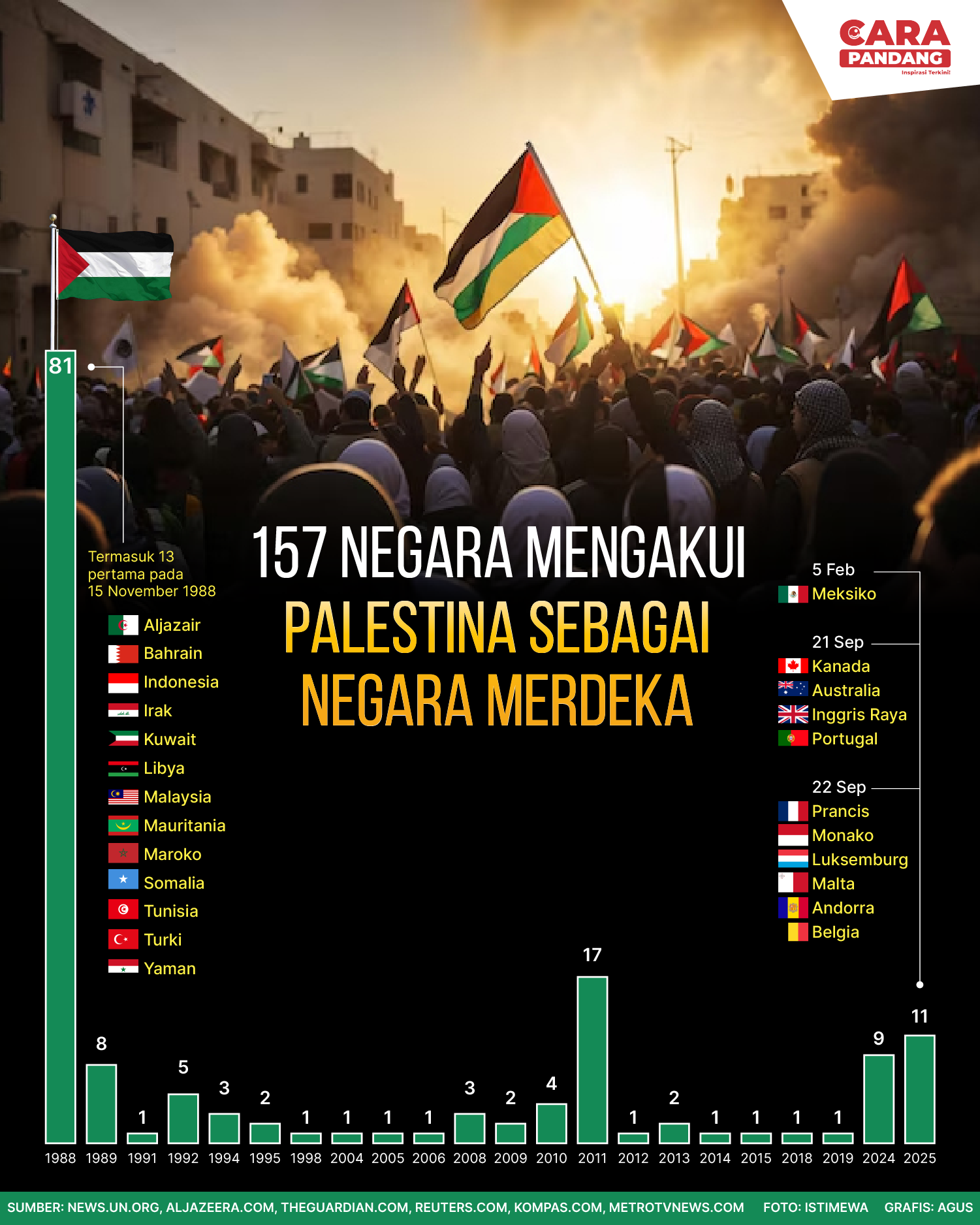 Beranda Infografis 157 Negara Akui Palestina Negara Merdeka Infografis 157 Negara Akui Palestina Negara Merdeka 157 Negara Akui Palestina Negara Merdeka Penulis Amira Izzati - 23 September 2025 21:50 0 157 Negara Akui Palestina Negara Merdeka Tags Berita Sebelumnya NasDem: Terlalu Dini Bicara Prabowo-Gibran 2 Periode, Pemilu Masih Lama Berita Berikutnya DPR Desak Pemerintah Gerak Cepat Atasi Krisis Air Bersih di Wilayah Terdampak Banjir Sumatera LEAVE A REPLY Cancel reply Comment: Please enter your comment! Name:* Please enter your name here Email:* You have entered an incorrect email address! Please enter your email address here Website: Save my name, email, and website in this browser for the next time I comment. Berita Teratas Pemimpin Thailand dan Kamboja Berbicara via Telepon dengan Trump, Bahas Konflik Perbatasan Potret Timur Tengah: Badai Musim Dingin Tewaskan Setidaknya 14 Orang di Gaza yang Porak-Poranda akibat Perang Program Edukasi Bermain Bantu Anak Atasi Kecemasan Saat MRI Gie, Prabowo Presiden Sekarang Masakan Italia Diakui sebagai Warisan Budaya Takbenda UNESCO Berita Terkait Berita Terkait Distribusi Bantuan Banjir Sumatra Lewat Udara Maliq - 06 Desember 2025 14:16 Dampak Banjir Aceh, Sumut dan Sumbar Zoel Rachman - 05 Desember 2025 08:47 Daftar Dosa Korupsi Netanyahu Zoel Rachman - 04 Desember 2025 12:52 Kutipan Pidato Hari Guru Nasional 2025 Maliq - 28 November 2025 12:12