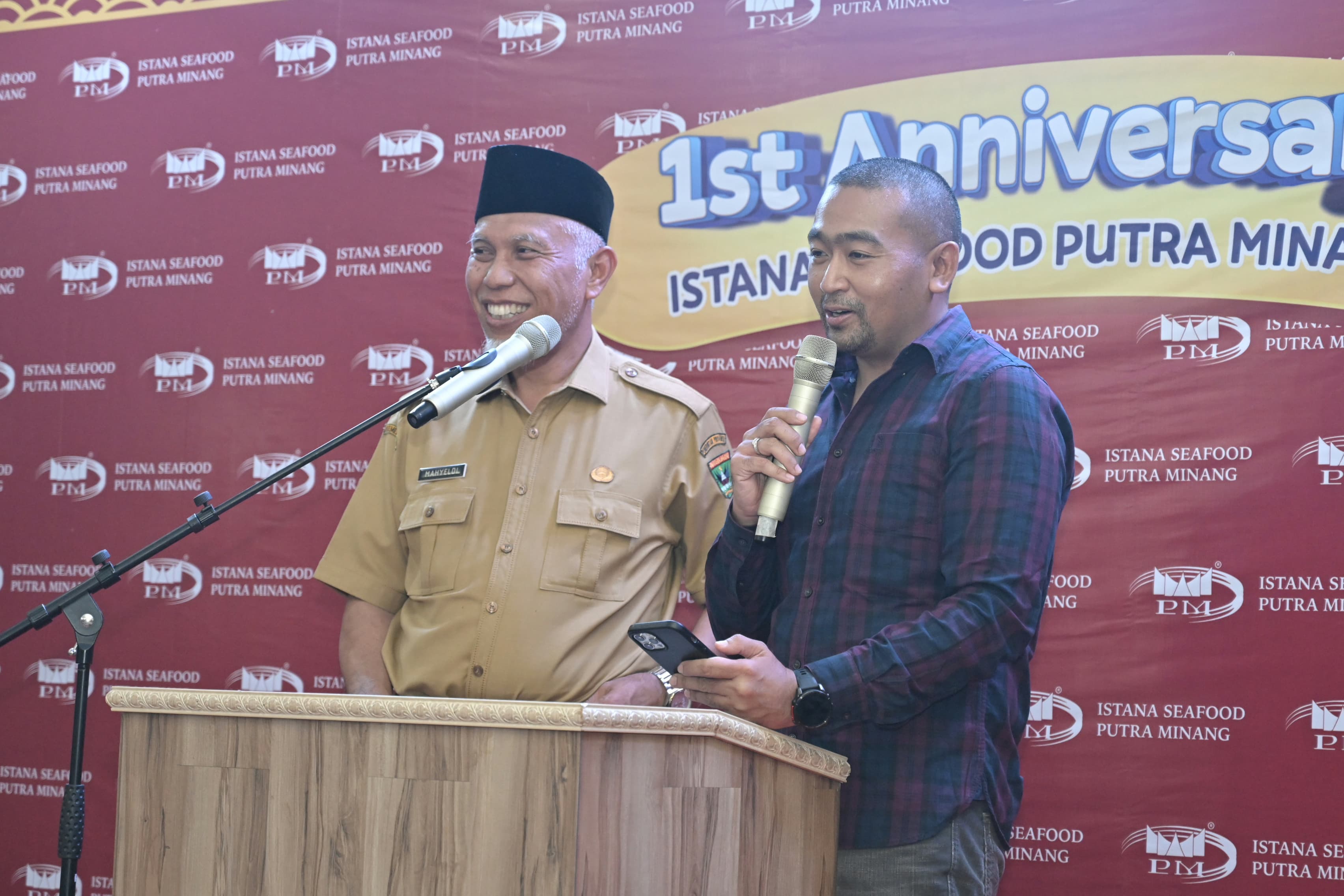 SUMBAR, CARAPANDANG - Gubernur Sumatera Barat (Sumbar) Mahyeldi Ansharullah dan Wagub Sumbar Audy Joinaldy, mengucapkan selamat atas dirayakannya Ulang Tahun Pertama (1st Anniversary) Istana Seafood Putra Minang. Keduanya menilai kehadiran restoran tersebut sangat berkontribusi dalam mendukung pertumbuhan industri pariwisata di Sumbar.