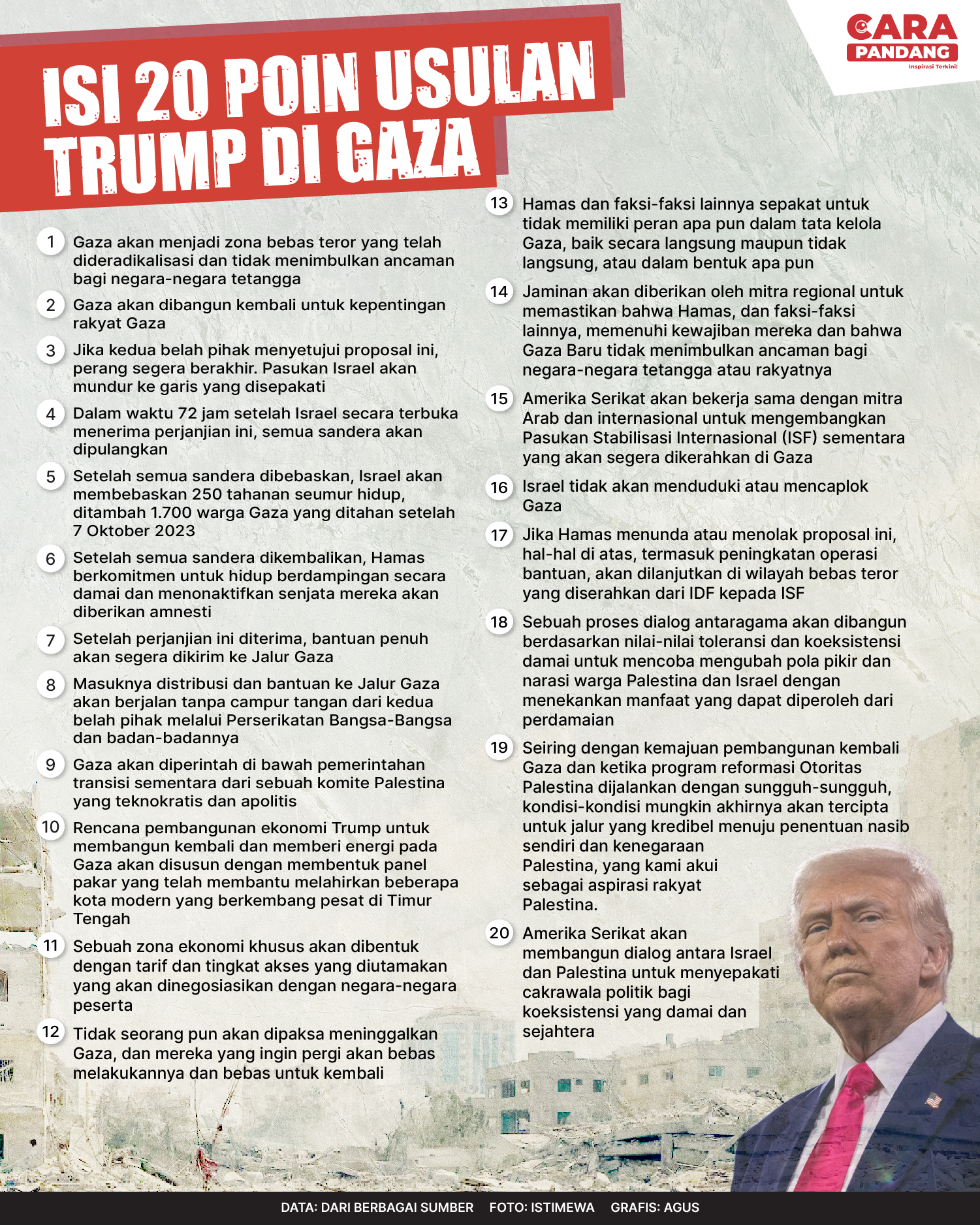 Beranda Infografis 20 Poin Usulan Trump di Gaza Infografis 20 Poin Usulan Trump di Gaza Penulis Amira Izzati - 10 Oktober 2025 11:13 0 20 Poin Usulan Trump di Gaza Tags Berita Sebelumnya Macron: Prancis Siap Jadi Bagian Pasukan Internasional di Gaza Berita Berikutnya Para Tahanan Pro-Palestina yang Mogok Makan di Inggris Hadapi Risiko Kematian LEAVE A REPLY Cancel reply Comment: Please enter your comment! Name:* Please enter your name here Email:* You have entered an incorrect email address! Please enter your email address here Website: Save my name, email, and website in this browser for the next time I comment. Berita Teratas Pemimpin Thailand dan Kamboja Berbicara via Telepon dengan Trump, Bahas Konflik Perbatasan Potret Timur Tengah: Badai Musim Dingin Tewaskan Setidaknya 14 Orang di Gaza yang Porak-Poranda akibat Perang Program Edukasi Bermain Bantu Anak Atasi Kecemasan Saat MRI Gie, Prabowo Presiden Sekarang Masakan Italia Diakui sebagai Warisan Budaya Takbenda UNESCO Berita Terkait Berita Terkait Distribusi Bantuan Banjir Sumatra Lewat Udara Maliq - 06 Desember 2025 14:16 Dampak Banjir Aceh, Sumut dan Sumbar Zoel Rachman - 05 Desember 2025 08:47 Daftar Dosa Korupsi Netanyahu Zoel Rachman - 04 Desember 2025 12:52 Kutipan Pidato Hari Guru Nasional 2025 Maliq - 28 November 2025 12:12