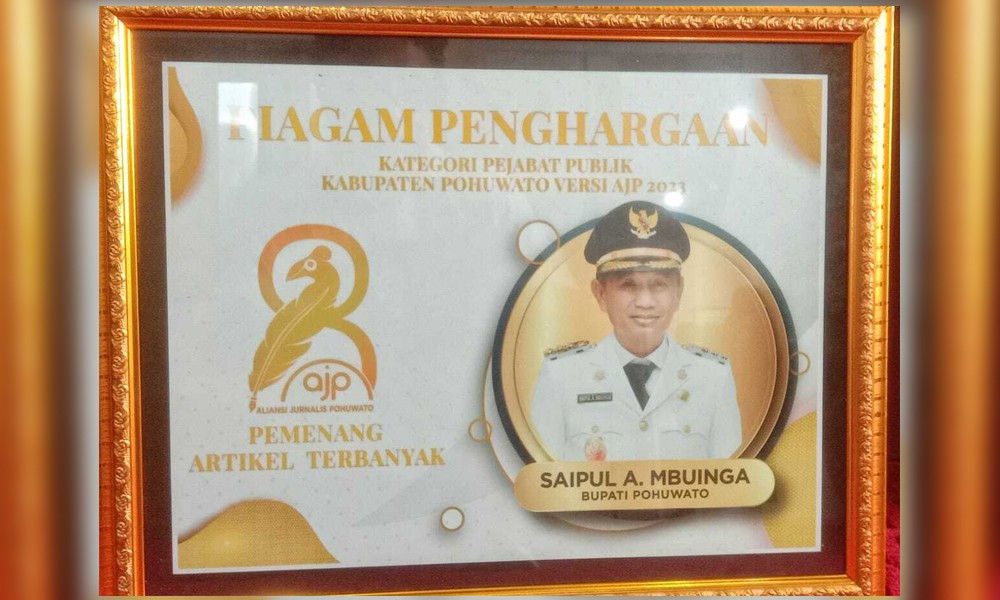 POHUWATO, CARAPANDANG.COM - Pada ajang AJP Award tahun 2023, Bupati Pohuwato, Saipul A. Mbuinga terpilih sebagai pemenang artikel terbanyak pada kategori pejabat publik Kabupaten Pohuwato Tahun 2023. Saipul A. Mbuinga berada di urutan urutan pertama mengungguli empat pejabat publik lainnya yaitu AKBP. Joko Sulistiono, Nirwan Due, Nasir Giasi dan Arman Mohammad.