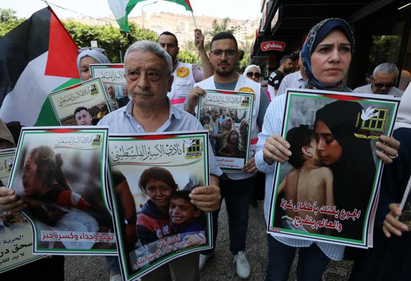 Warga Palestina berpartisipasi dalam aksi demonstrasi menentang perang yang sedang berlangsung di Jalur Gaza dan kebijakan kelaparan yang diberlakukan terhadap penduduk Gaza di Kota Nablus, Tepi Barat, pada 29 Juli 2025. (Xinhua/Nidal Eshtayeh)