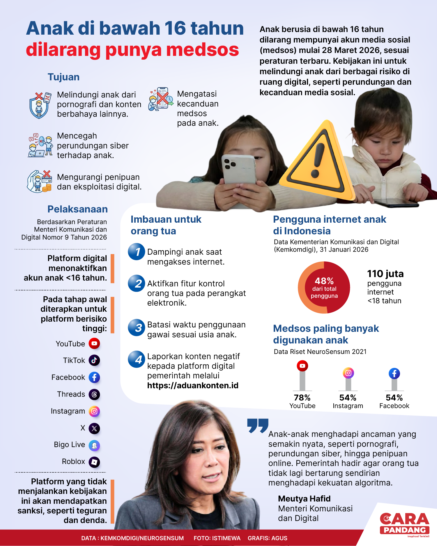 Anak berusia dibawah 16 tahun dilarang mempunyai akun media sosial (medsos) mulai 28 Maret 2026