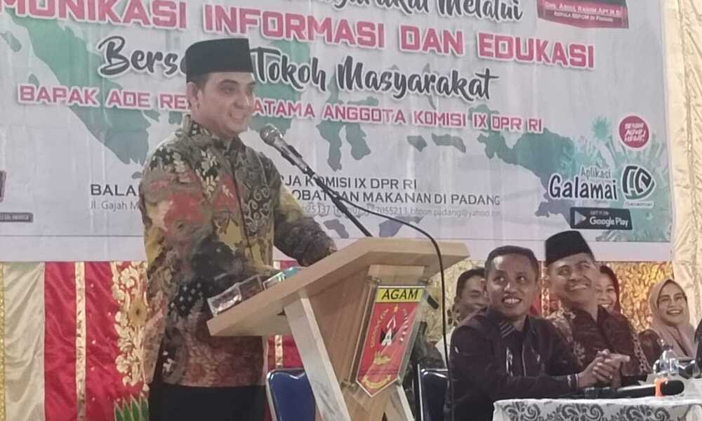 AGAM, CARAPANDANG.COM - Anggota Komisi IX DPR RI, Ade Rezki Pratama bersama Balai Besar Pengawasan Obat dan Makanan (BBPOM) Padang menggelar kegiatan pemberdayaan masyarakat melalui Komunikasi Informasi dan Edukasi (KIE) Keamanan Obat dan Makanan di Hall Badminton Kelurahan Tabek Panjang Kecamatan Baso, Kabupaten Agam pada Minggu (08/10).