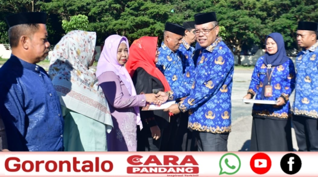 POHUWATO, CARAPANDANG - Di sela Apel Korpri yang digelar di halaman kantor sementara Bupati Pohuwato, Kamis (17/04/2025), Pelaksana Harian (Plh) Sekretaris Daerah Pohuwato, Mahyudin Ahmad, menyerahkan Surat Keputusan (SK) Pensiun kepada ahli waris dari sejumlah ASN yang telah meninggal dunia.