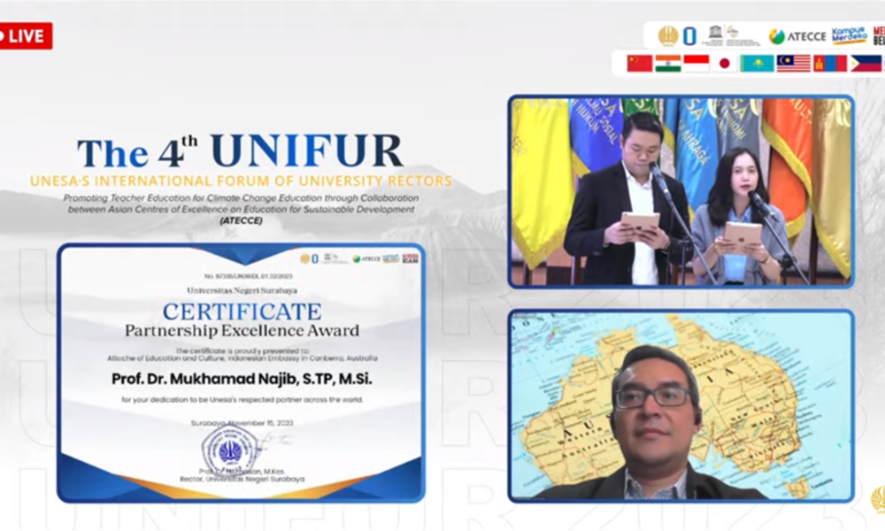 CARAPANDANG - Atase Pendidikan dan Kebudayaan (Atdikbud) Kedutaan Besar Republik Indonesia di Canberra, Australia, Mukhamad Najib, yang juga merupakan dosen pada Departemen Manajemen Institut Pertanian Bogor (IPB) University, meraih penghargaan ‘Partnership Excellence Awards’ peringkat pertama dalam acara The 4th UNESA’S International Forum Of University Rectors (UNIFUR) yang diselenggarakan oleh Universitas Negeri Surabaya (UNESA), pada Rabu (15/11). Sementara, pada peringkat kedua ‘Partnership Excellence Awards’ diraih oleh Atdikbud KBRI Seoul, Gogot Suharwoto.