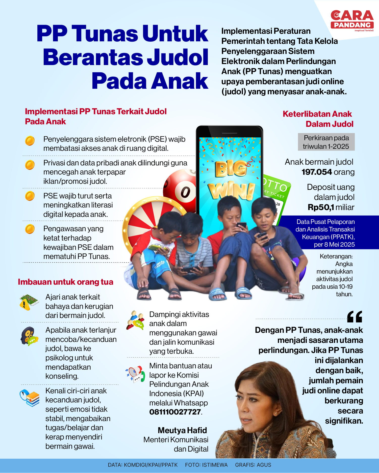 Beranda Infografis Berantas Judol Pada Anak Infografis Berantas Judol Pada Anak Penulis Amira Izzati - 20 Mei 2025 13:00 0 Berantas Judol Pada Anak of Tags Berita Sebelumnya Pemkab Pohuwato Raih Penghargaan dari BPK dalam PTL Pemeriksaan Semester II Tahun 2024 Berita Berikutnya Para Tahanan Pro-Palestina yang Mogok Makan di Inggris Hadapi Risiko Kematian LEAVE A REPLY Cancel reply Comment: Please enter your comment! Name:* Please enter your name here Email:* You have entered an incorrect email address! Please enter your email address here Website: Save my name, email, and website in this browser for the next time I comment. Berita Teratas Pemimpin Thailand dan Kamboja Berbicara via Telepon dengan Trump, Bahas Konflik Perbatasan Program Edukasi Bermain Bantu Anak Atasi Kecemasan Saat MRI Potret Timur Tengah: Badai Musim Dingin Tewaskan Setidaknya 14 Orang di Gaza yang Porak-Poranda akibat Perang Gie, Prabowo Presiden Sekarang Maruarar Sirait: Kita Samakan Data, Baru Relokasi Dan Bangun Rumah Korban Banjir Sumatera Berita Terkait Berita Terkait Distribusi Bantuan Banjir Sumatra Lewat Udara Maliq - 06 Desember 2025 14:16 Dampak Banjir Aceh, Sumut dan Sumbar Zoel Rachman - 05 Desember 2025 08:47 Daftar Dosa Korupsi Netanyahu Zoel Rachman - 04 Desember 2025 12:52 Kutipan Pidato Hari Guru Nasional 2025 Maliq - 28 November 2025 12:12