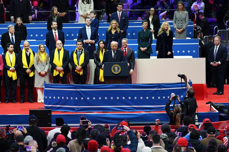 Presiden Amerika Serikat Donald Trump (tengah, depan) menyampaikan pidato di arena Capital One di Washington DC, Amerika Serikat, pada 20 Januari 2025. (Xinhua/Li Rui)