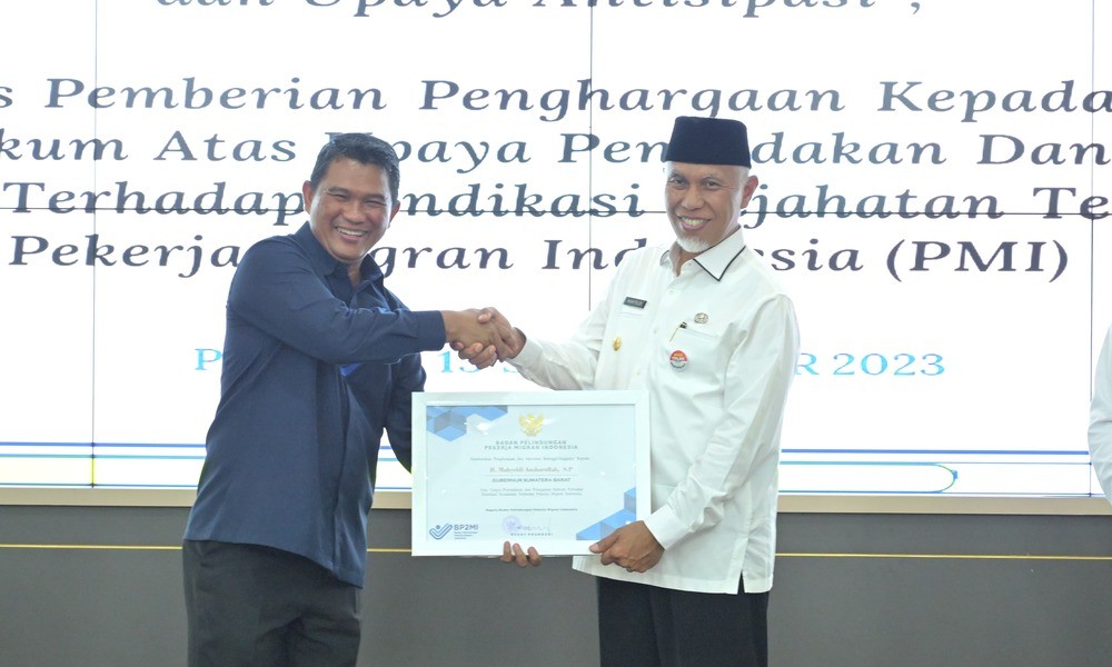 SUMBAR, CARAPANDANG.COM - Gubernur Sumatera Barat (Sumbar) Mahyeldi Ansharullah, meraih penghargaan berkat upaya perlindungan dan penegakan hukum terhadap sindikasi kejahatan kepada Pekerja Migran Indonesia (PMI). Penghargaan yang juga diraih oleh Kapolda Sumbar beserta jajaran tersebut diserahkan oleh Badan Perlindungan Pekerja Migran Indonesia (BP2MI) di Auditorium Istana Gubernur Sumbar, Rabu (13/09/2023).