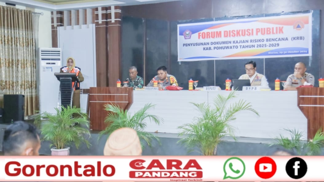 POHUWATO, CARAPANDANG - Kabupaten Pohuwato merupakan salah satu kawasan yang rawan bencana, terbukti banyaknya kejadian bencana yang terjadi belakangan ini yang mengakibatkan kerugian yang tidak sedikit, dengan kejadian tersebut memberikan pengaruh negatif kepada jalannya roda pemerintahan maupun kehidupan masyarakat. Demikian disampaikan Plt. Bupati Pohuwato, Suharsi Igirisa ketika membuka Forum Diskusi Penyusunan Dokumen Kajian Resiko Bencana (KRB) tahun 2025-2029 di aula Dinas PU Pohuwato, Selasa, (29/10/2024).