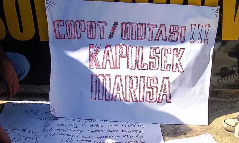 Selebaran berisi tulisan "Copot Mutasi Kapolsek Marisa" menjadi poin utama pada aksi damai tersebut.