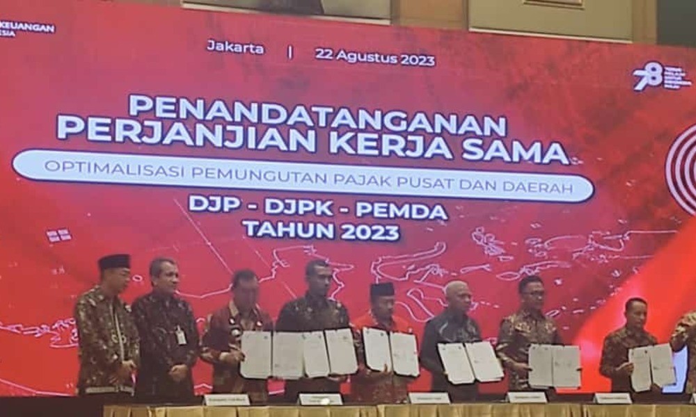 Penandatanganan perjanjian dilakukan oleh Direktur Jenderal Pajak, Direktur Jenderal Perimbangan Keuangan dengan 113 Kepala Daerah (Gubernur/Bupati/Walikota) se Indonesia.