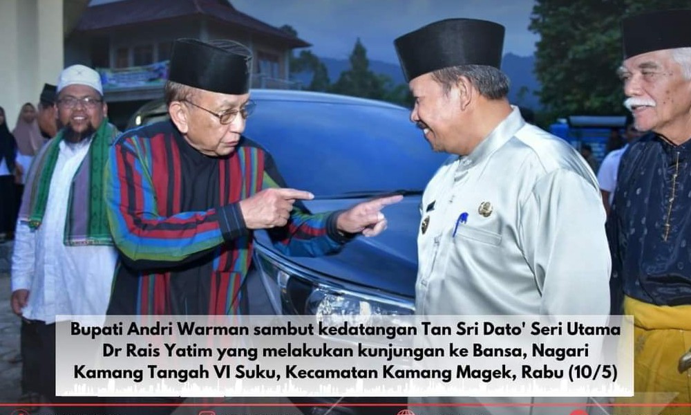 AGAM, CARAPANDANG.COM - Bupati Agam, Dr H Andri Warman sambut kedatangan Tan Sri Dato' Seri Utama Dr Rais Yatim yang melakukan kunjungan ke Bansa, Nagari Kamang Mudiak, Kecamatan Kamang Tangah VI Suku, Rabu (10/5).