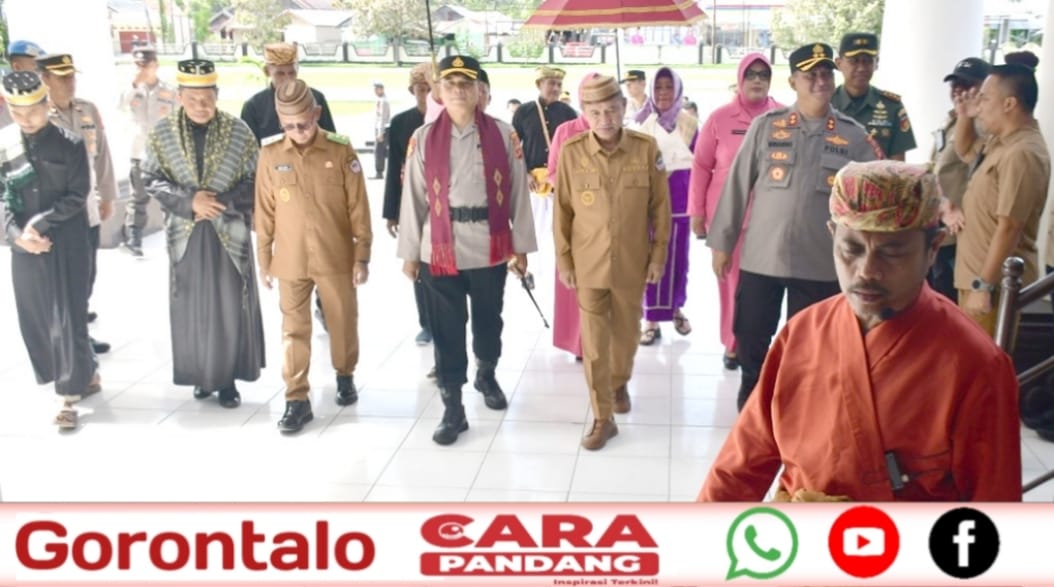 POHUWATO, CARAPANDANG - Bupati Pohuwato, Saipul A. Mbuinga, bersama Wakil Bupati, Iwan S. Adam, menyambut pejabat baru Kapolres Pohuwato, AKBP Busroni, S.I.K.,M.H. Kedatangan Kapolres bersama istri itu disambut dengan prosesi adat Mopotilolo, Senin (24/03/2025).
