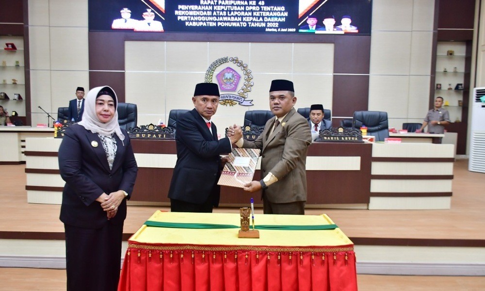 POHUWATO, CARAPANDANG.COM - Bupati Pohuwato, Saipul A. Mbuinga bersama Wakil Bupati, Suharsi Igirisa menghadiri rapat paripurna ke-48 penyerahan keputusan DPRD tentang rekomendasi atas laporan keterangan pertanggung jawaban kepala daerah Kabupaten Pohuwato tahun 2022. Paripurna yang berlangsung di ruang rapat DPRD Pohuwato di pimpin Ketua DPRD Pohuwato, Nasir Giasi didampingi Wakil Ketua DPRD, Nirwan Due, Selasa, (6/6/2023).