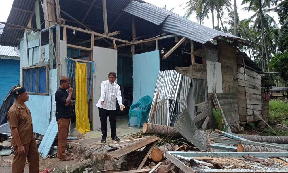 Rumah milik Nasir Pakaya dan Lisdah Lasarutu yang hancur akibat tertimpa pohon kelapa pada Senin kemarin jelang buka puasa ditinjau Bupati Pohuwato, Saipul A. Mbuinga, Selasa (28/3/2023).
